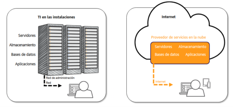 En un entorno de TI tradicional, todos los componentes físicos necesarios para ejecutar sistemas empresariales era propiedad de la empresa, que se encargaba de su funcionamiento, mantenimiento y alojamiento. Un usuario se conectaba e iniciaba sesión en la red corporativa para obtener acceso a los recursos , se incluían aplicaciones corporativas, el uso compartido de archivos y el almacenamiento.