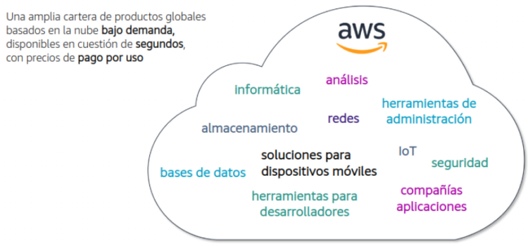 AWS ofrece una amplia cartera de productos globales basados en la nube, incluidos el computo, el almacenamiento, la base de datos, los análisis, las redes, los dispositivos móviles, las herramientas para desarrolladores, las herramientas de administración, el Internet de la cosas, la seguridad y la aplicaciones empresariales bajo demanda y disponibles en segundos y con precios de pago por uso. Desde el almacenamiento de datos hasta las herramientas de implementación, y de los directorios a la entrega de contenido.