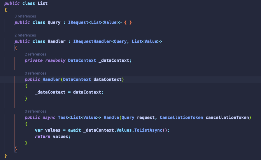 En el proyecto Application crearemos una carpeta con el nombre de la entidad que crearemos el CRUD en nuestro caso una carpeta llamada Values. Dentro de está creamos una clase llamada List.cs