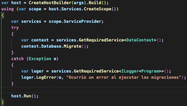 Para ejecutar las migraciones lo podemos hacer mediante líneas de comando pero en este ejemplo modificaremos el Program para ejecutar todas las migraciones cuando ejecutemos la aplicación.
